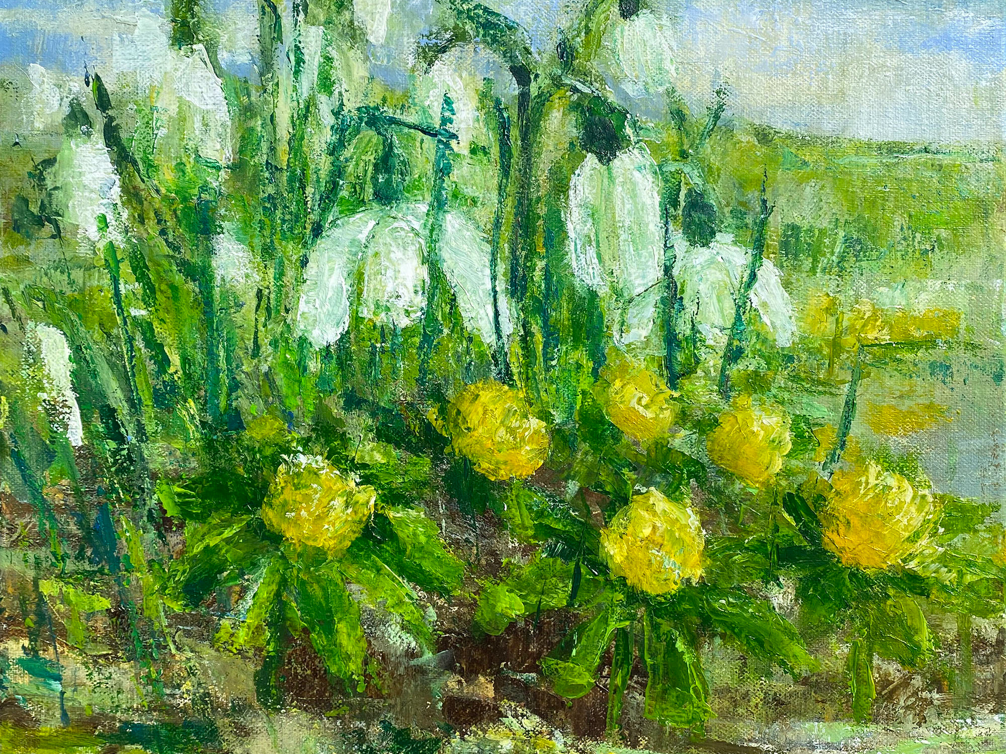 I aim to create artworks that are full of feeling and trigger memories. I hope my work will connect you to events, places or plants that are special to you. I'm happy to discuss commissions, where we work together to agree subject, size and style, so that I create something special you will love for your currently unloved spaces. My gallery below shows my most recent works, lightly separated into subjects and styles. Bramble Copse is my favourite woodland and over 2026, I will be making 12 canvases, which in 2027 I intend to shown together and sell as framed prints. If you would like to chat about my art, call me in Dorking, Surrey, UK on 0771 2932630 or email carolinesalmon@icloud.com. Look below to see my work, which is lightly separated into subjects and styles.