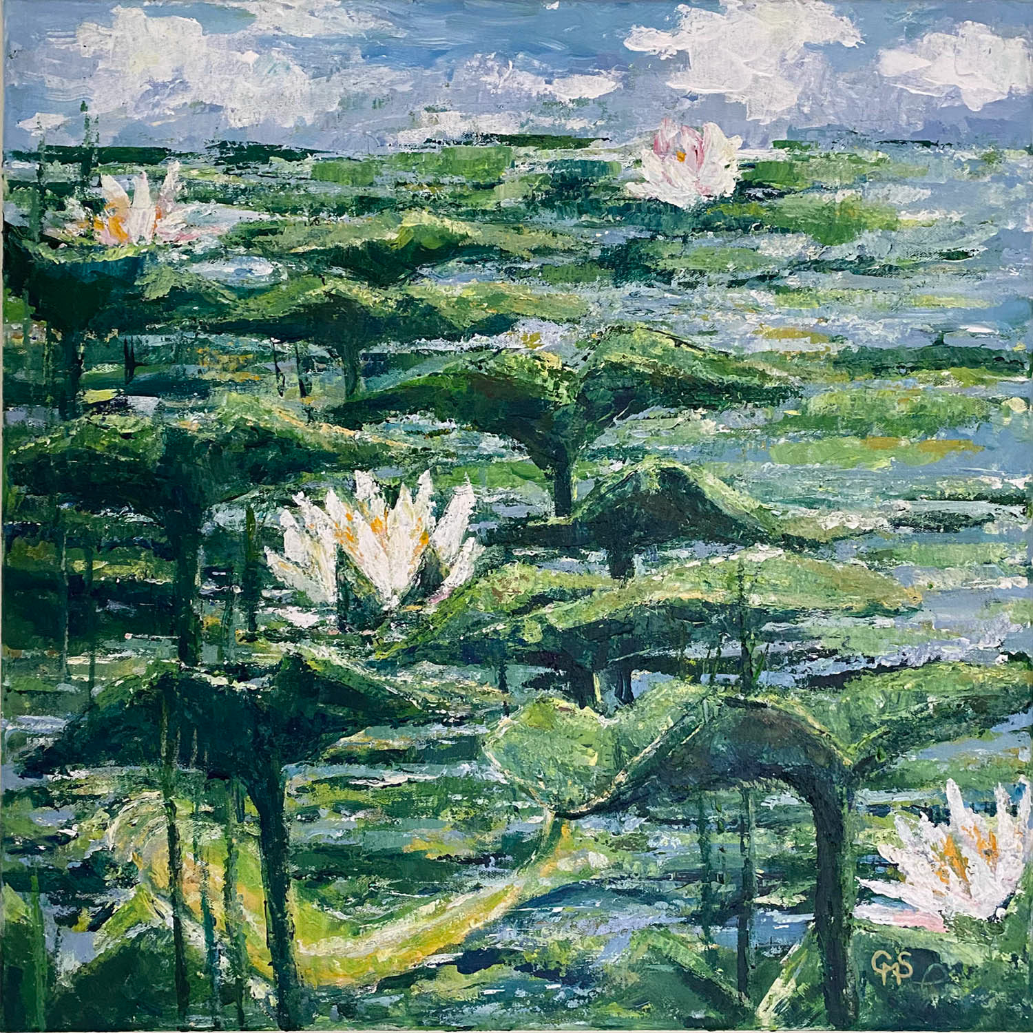 Acrylic on Canvas Inspired by water lily leaves and flowers in my pond